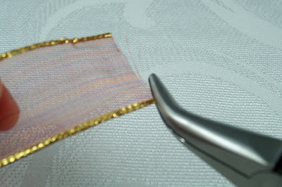 Step 1 - Cut a piece of 1" (25 mm) wide organza ribbon 1-2 inches longer than you want your finished cord to be. If there is wire running through the edges, then pull them out with pliers.