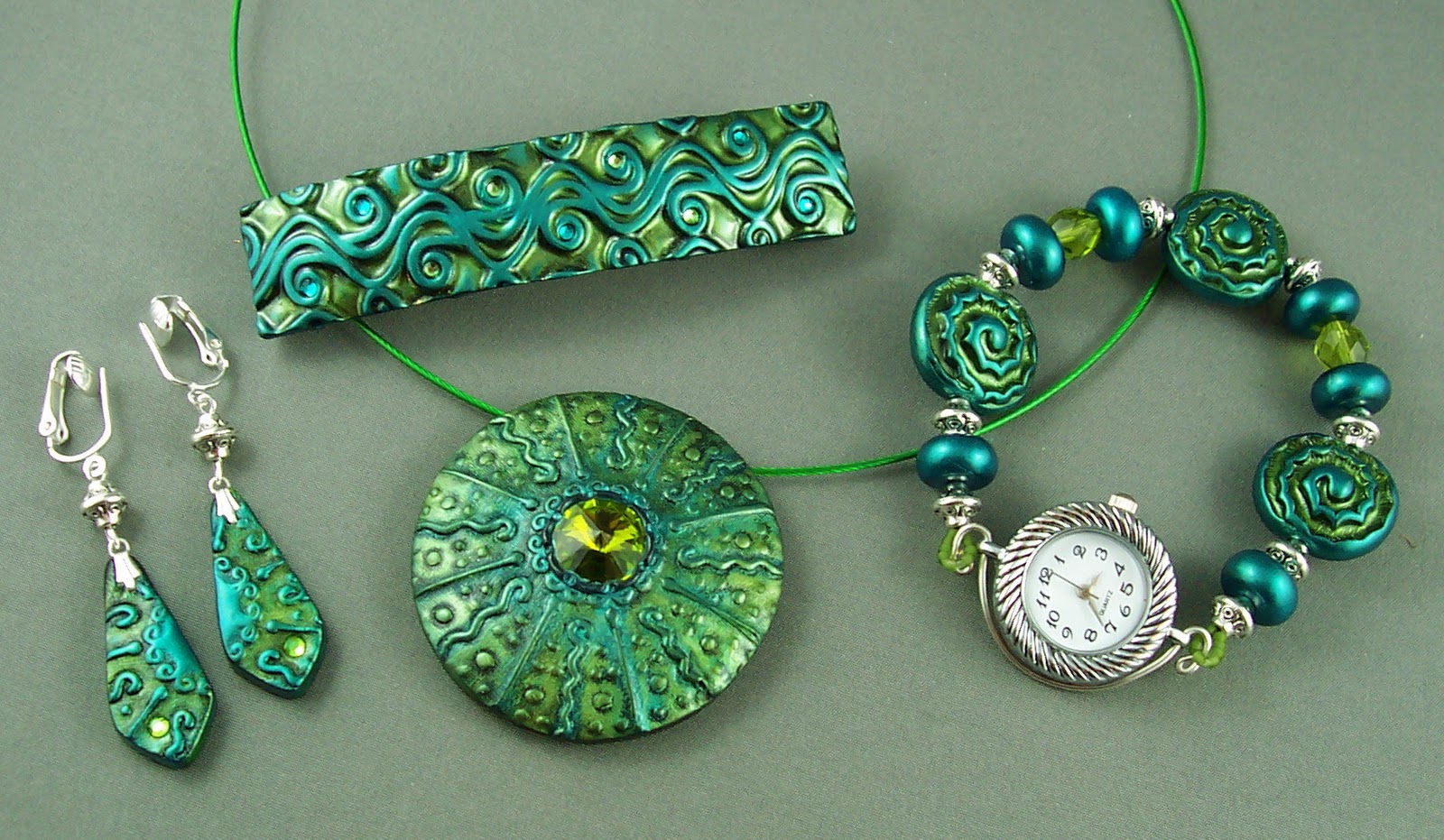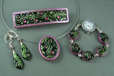 One of the greatest perks of being a clay-jewelry artist is that I get to go shopping for new clothes and then make as many jewelry and accessory pieces for myself as I want that match so I can show them off! I'm really into the matchy thing and so when I create a piece for myself I have to make a whole set that coordinates which usually includes a pendant or beaded necklace, earrings, watch bracelet and hair barrette. I might even make matching buttons for a blouse or sweater. I'm working on some new belt designs as well which I will show you later when they are finished.