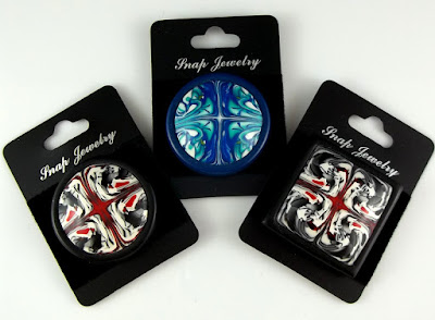 And if you aren't into making your own cards and want something already made, we have some new cards available in our online store in the DIY Snap Supplies section. These cards are a soft plastic with a plush velvet background and a center hole ready to hang. Snap jewelry is printed in silver on the front of the card and you can always add a sticker with your name on the very bottom or on the back. The cards are 1-1/2" wide and the larger snaps on the cards shown below are 1-1/8" and fit quite nicely on them.