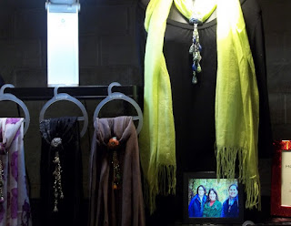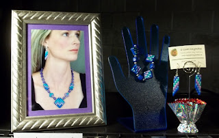 It started with a Ladies Night charity fundraiser at our local Home Hardware store where I had a display featuring our new scarf jewelry and interchangeable earring system. I was so busy I completely forgot about taking a photo of my table set-up. I did manage, however, to take a picture of Laura in her gorgeous gown and wearing one of our scarf jewelry sets.