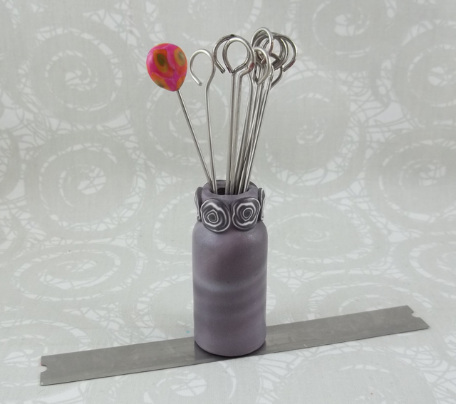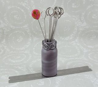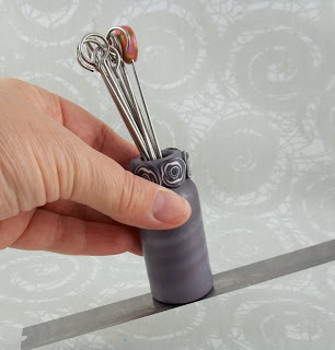 This tool is actually three in one and my absolute favorite.  I covered a little jar with clay and it sits on my clay table to hold my bead piercing tools.  I covered the end of one of my bead tools so it is easy to find and grab when needed.   The cool thing about this little jar is ......