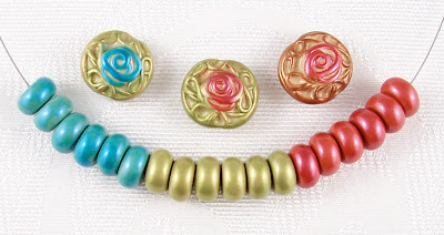 The rondelles on the bracelet and necklace are part of our new pearl collection. I have been working on perfecting our rondelle spacers and these ones have mica powders applied that match the textured beads. The luster on them is extremely deep and rich looking and they come out super smooth.