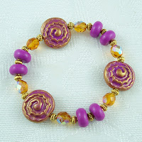 These are our Funky Swirl Beads in a choice of five yummy colors. The fun stretch bracelet shown is in the Purple Orchid (Pantone fall 2010 color) beads and include some of our new larger-size 10 mm rondelle spacers in the same matching color.