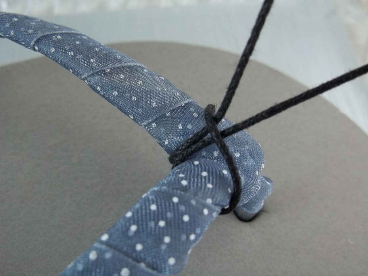Step 12 - Cut two pieces of cotton cord or string and bring it up the same way as in steps 9 and 10 above.