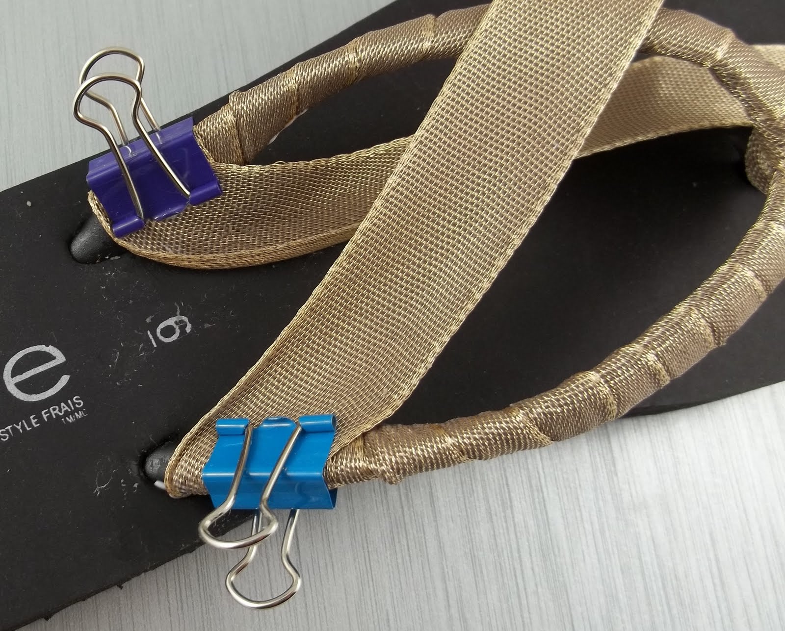 Variation: Here I used a heavier type grosgrain ribbon for these flip flops so rather than tying at the end I instead applied lots of tacky glue and wrapped them around several times to hold. I used binder clips to hold it until the glue was completely dry. If your ribbon wants to fray out at the end, you can apply fray stop or the glue itself can prevent the ribbon from unravelling. Allow to dry and then trim the ends.