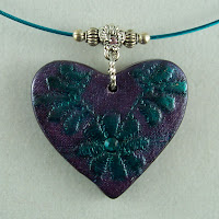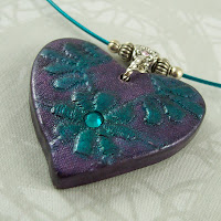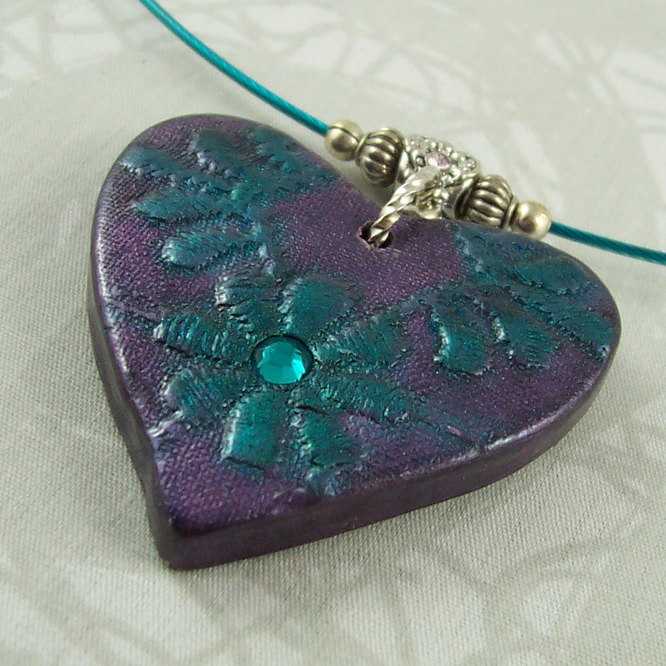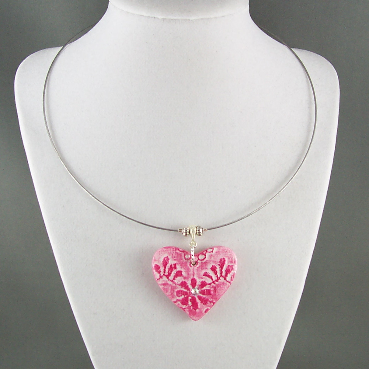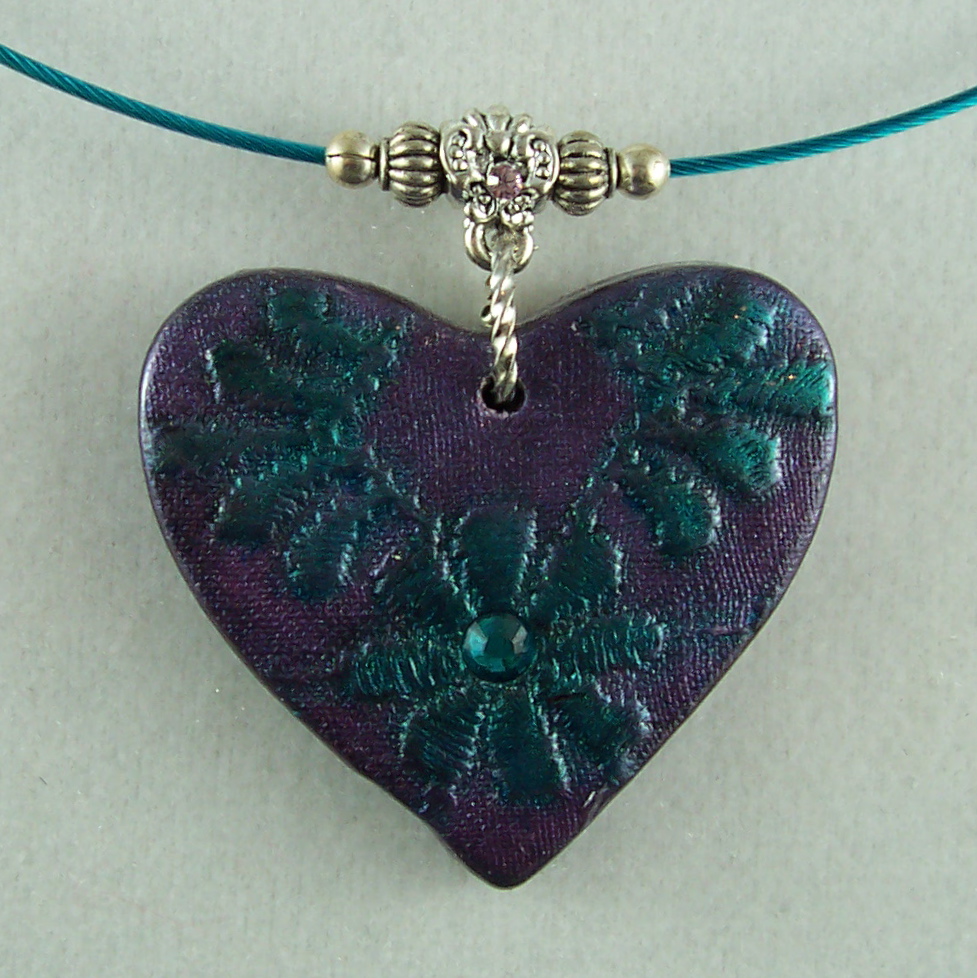 This heart is in berry pink and is handcrafted from polymer clay using vintage lace as a texture and then highlighted with chalks and mica powders. There is a Swarovski crystal embedded into the center and is hanging from a pretty silver plated bail. It is on a nylon coated steel cable with our "signature" barrel type clasp.